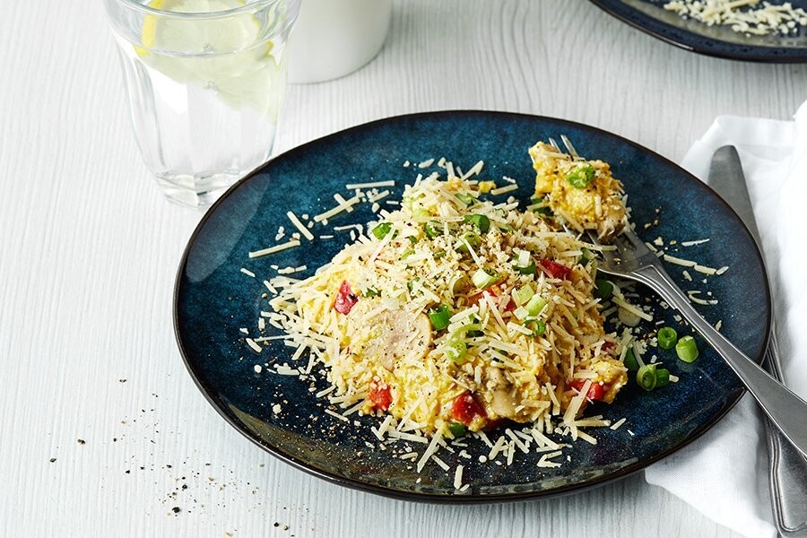 Huevos revueltos con champiñones salteados, pimientos, queso parmesano por encima y cebolleta fresca. Un plato delicioso, rápido, sencillo y muy keto.